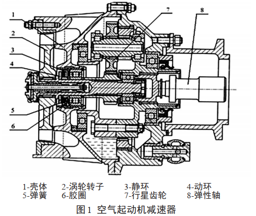 如图 1所示为某型俄制涡轴发动机专用空气起动机的减速器组件。空气起动机工作时,增压空气冲击空气起动机涡轮,带动涡轮转子高速旋转,通过减速器将扭矩传递给发动机燃气发生器转子,带动发动机起动。空气起动机的减速器为行星齿轮式,内部采用滑油润滑,为防止滑油泄漏,转速输入端的涡轮转子与外部采用石墨环密封,输出端弹性轴与外部采用皮碗密封。